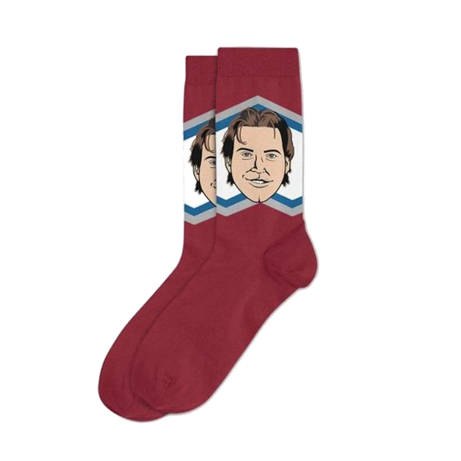 The Colorado Avalanche Major League hockey socks are fashionable socks designed for your day offs. Made with 80% cotton, 15% nylon and 5% lycra, the blended fabric provides tremendous comfort without comprising style. Each sock features a full-color, original caricature of some of the team’s best players, both past and present. These socks are packaged in a collectible display tray.