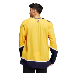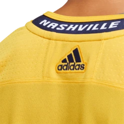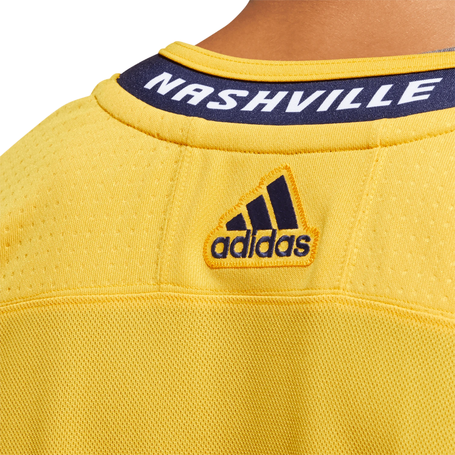 Pull on this adidas Nashville Predators authentic home jersey, and get the gang together for game night in your fan cave. AEROREADY keeps you cool and dry as you wait for the puck to drop at center ice. The big crest out front, shoulder patches and a fight strap with a snap closure keep the look legit. This product is made with Primegreen, a series of high-performance recycled materials.