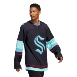 Pull on the Seattle Kraken Home Adidas PrimeGreen Senior Jersey, and get the gang together for game night in your fan cave. AEROREADY keeps you cool and dry as you wait for the puck to drop at center ice. The big crest out front, shoulder patches and fight strap with a snap closure keep the look legit. This jersey is made with Primegreen, a series of high-performance recycled materials.