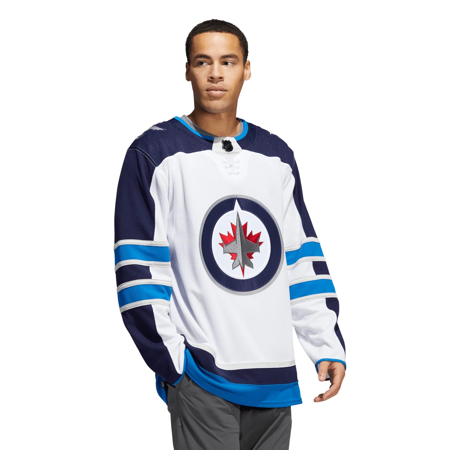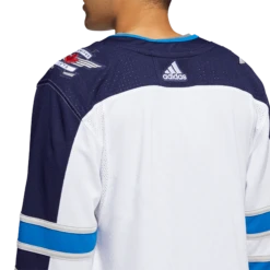 Pull on this adidas Winnipeg Jets authentic away jersey, and get the gang together for game night in your fan cave. AEROREADY keeps you cool and dry as you wait for the puck to drop at center ice. The big crest out front, shoulder patches and a fight strap with a snap closure keep the look legit. This product is made with Primegreen, a series of high-performance recycled materials.